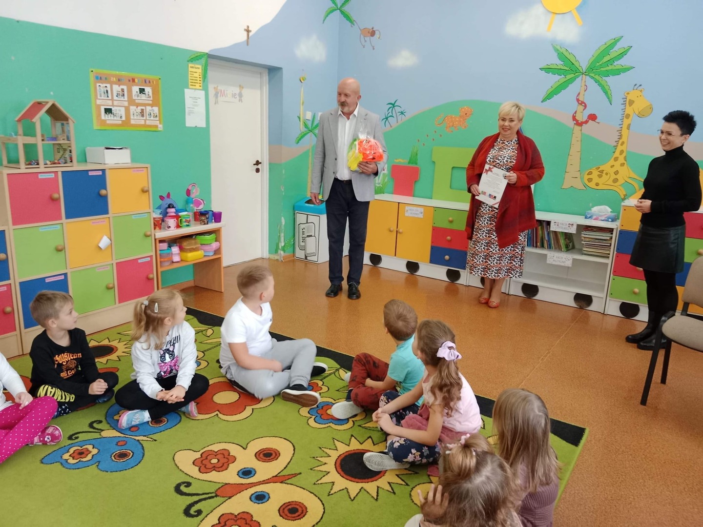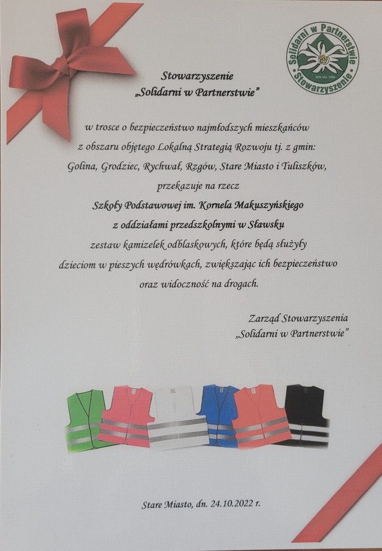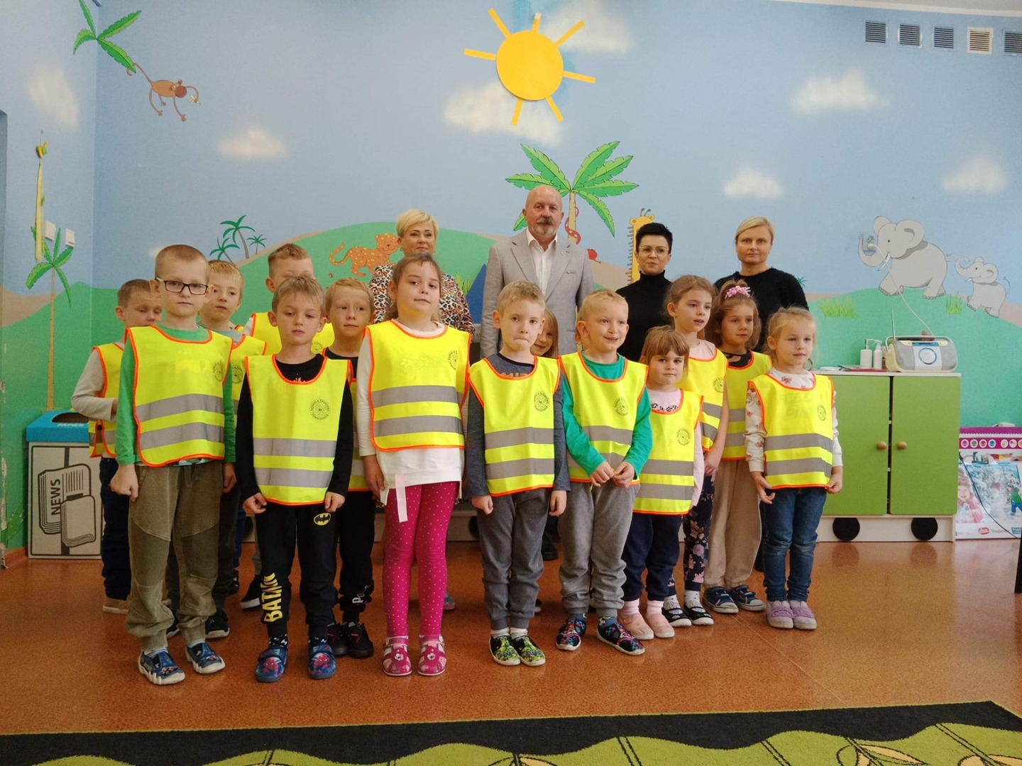 24 pażdziernika 2022r. dzieci z oddziału przedszkolnego "MISIE" otrzymały kamizelki odblaskowe, które zostały przekazane przez Pana Ireneusza Ćwieka - Prezesa Stowarzyszenia "Solidarni w Partnerstwie" oraz Panią Iwonę Bańdosz - Dyrektora Biura Stowarzyszenia. Dzięki podarowanym komizelkom nasze dzieci będą widoczne, a przede wszystkim bezpieczne podczas spacerów i wycieczek.