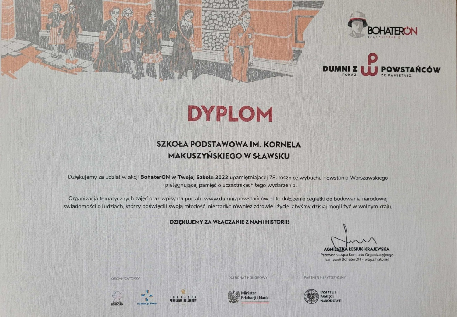 Nasza szkoła po raz drugi włączyła się do tej akcji. Uczniowie klas IV – VI uczestniczyli w lekcjach o tematyce patriotycznej, uświadamiającej ogromną rolę i poświęcenie uczestników Powstania Warszawskiego oraz promocję historii Polski XX wieku.