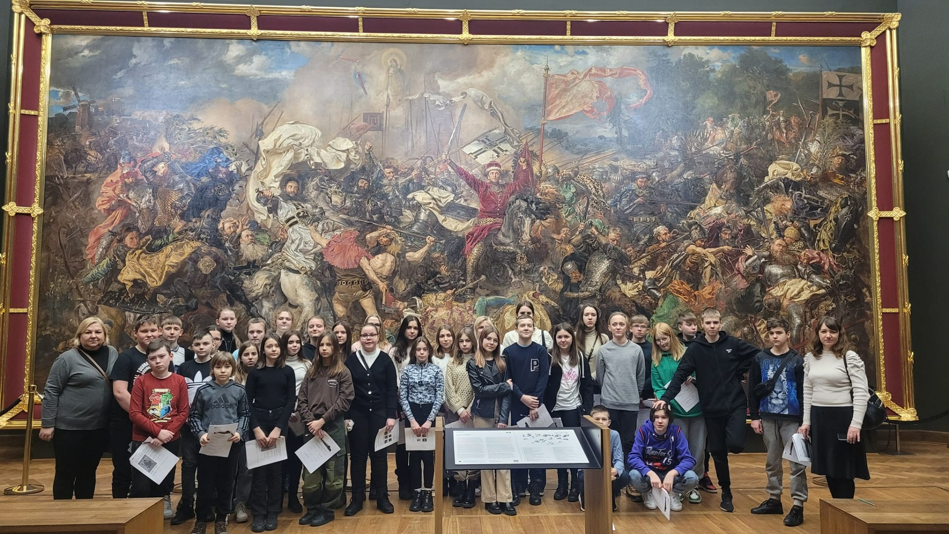 Nasi uczniowie mogli uczestniczyć w lekcji muzealnej: „Muzealne przeboje”. Zdobywali wiedzę i nabywali kompetencje kulturowe. Rozwiązywali zadania i słuchali ciekawostek na temat poszczególnych dzieł. Zapoznali się Galerią Sztuki Dawnej, gdzie podziwiali najsłynniejszą XVIII wieczną zastawę stołową wyprodukowaną w najstarszej manufakturze porcelany w Miśni. W Muzeum Narodowym znajduje się 53 sztuki słynnego Serwisu Łabędziego. Następnie pani przewodnik zaprowadziła wszystkich do Galerii Sztuki XIX Wieku, gdzie mieliśmy okazję podziwiać m. in. obraz Bernardo Bellottego zwanego Canaletto „Widok Warszawy z tarasu Zamku Warszawskiego z 1773 roku”. Obraz został namalowany na specjalne zamówienie króla Stanisława Augusta Poniatowskiego, płaszcz koronacyjny i insygnia koronacyjne Augusta III. Niewątpliwą atrakcją był największy polski obraz Jana Matejki „Bitwa pod Grunwaldem”. Dzieło to artysta malował przez sześć lat (1872-1878), posiłkując się „Rocznikami” Jana Długosza. Ostatecznie udało mu się osiągnąć niesamowity efekt – na płótnie o rozmiarach 426 x 987 cm w sposób monumentalny przedstawił jedno z najważniejszych wydarzeń w polskiej historii. Zwiedziliśmy również Galerię Sztuki Starożytnej gdzie znajduje się sarkofag i kartonaż kapłana Hor Dżehuti z mumią nieznanej kobiety z przed ok. 2 tys. lat temu.