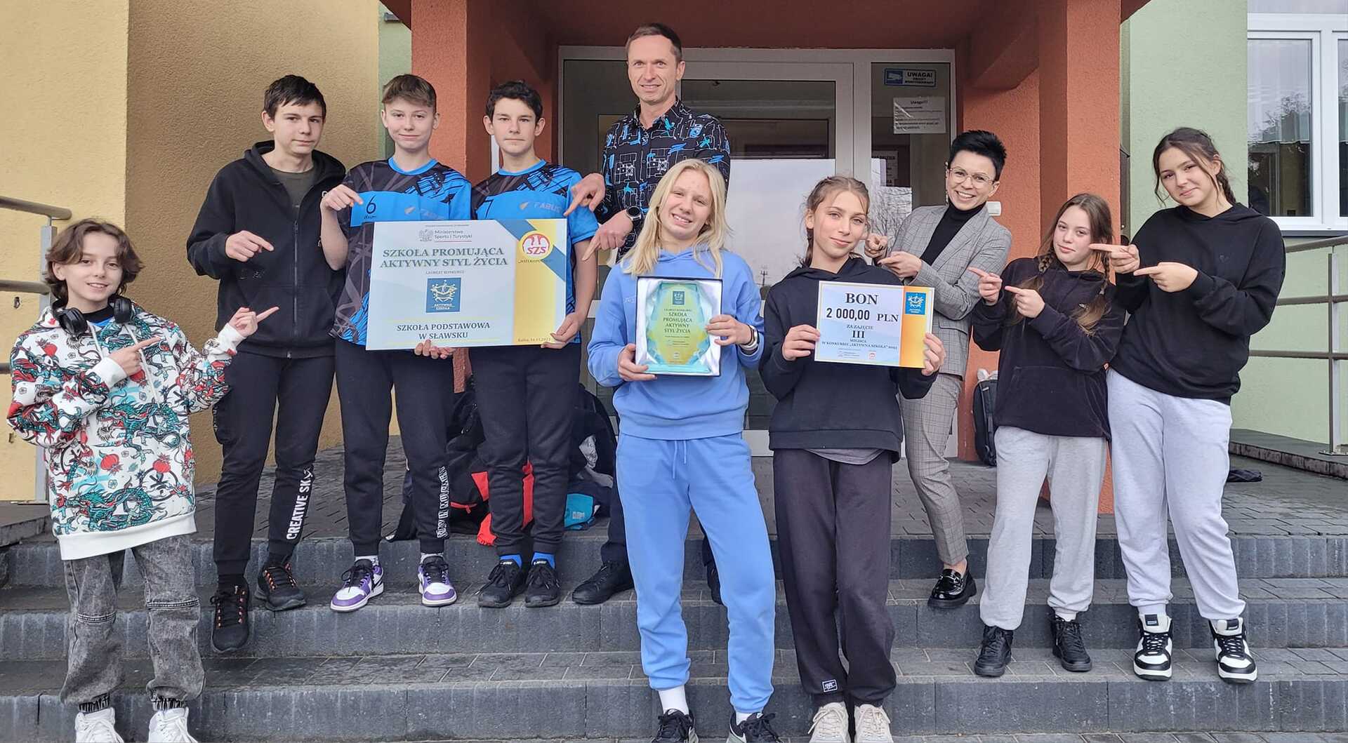 Kapituła konkursowa przyznała naszej placówce III miejsce w kategorii szkół podstawowych w województwie wielkopolskim. Podczas uroczystości Szkoła Podstawowa w Sławsku otrzymała tytuł „SZKOŁY PROMUJĄCEJ AKTYWNY STYL ŻYCIA” oraz nagrodę w wysokości 2.000 zł.