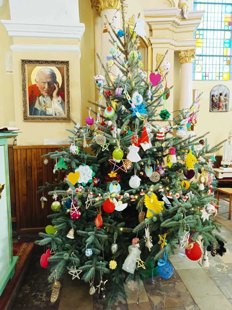 Uczniowie naszej szkoły wraz z rodzicami wykonali przepiękne ozdoby świąteczne, którymi udekorowano jedną z choinek w kościele parafialnym. Dziękujemy księdzu proboszczowi Tomaszowi Jenerowi za pozytywne przyjęcie naszego pomysłu.