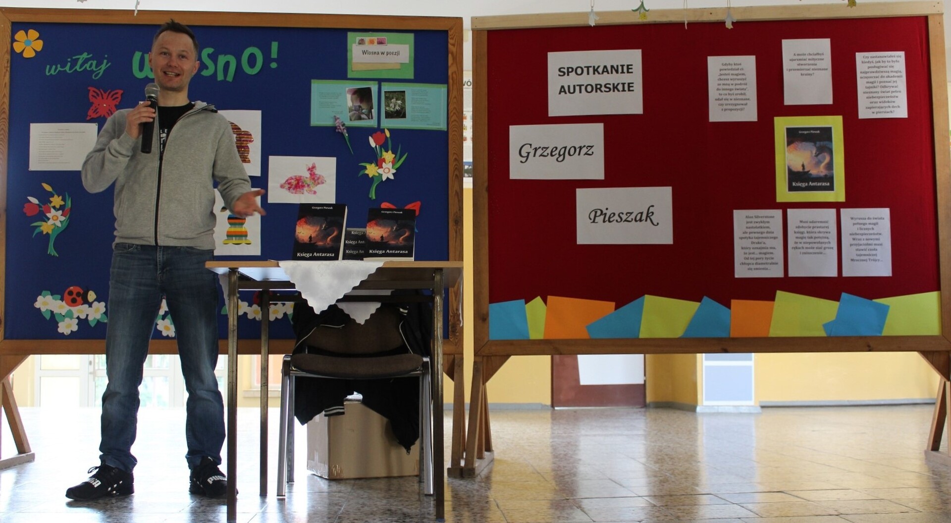 Wizyta autora nowo wydanej książki cieszyła się dużym zainteresowaniem zarówno wśród młodszych, jak i starszych uczniów. Grzegorz Pieszak promował „Księgę Antarasa", która wzbudziła duże zainteresowanie wśród uczniów. Uczniowie byli zafascynowani opowieścią o dzielnym nastolatku Alanie Silverstonie, który musi stawić czoła różnorodnym wyzwaniom. Pan Grzegorz powiedział uczniom o swojej pasji pisania i tworzenia niesamowitych światów. Odpowiadał też na pytania dotyczące jego twórczości, inspiracji oraz ulubionych książek. Podkreślił, jak ważne jest dla niego rozwijanie wyobraźni i nieustanne poszukiwanie nowych historii. Zainspirował młodych słuchaczy, dzieląc się historiami o swoim procesie twórczym, od pomysłu po publikację. Po spotkaniu uczniowie mieli okazję zdobyć autograf pisarza na egzemplarzach jego książki. Wielu z nich przyznało, że było to wyjątkowe doświadczenie, inspirujące do czytania, a nawet spróbowania swoich sił w pisaniu.